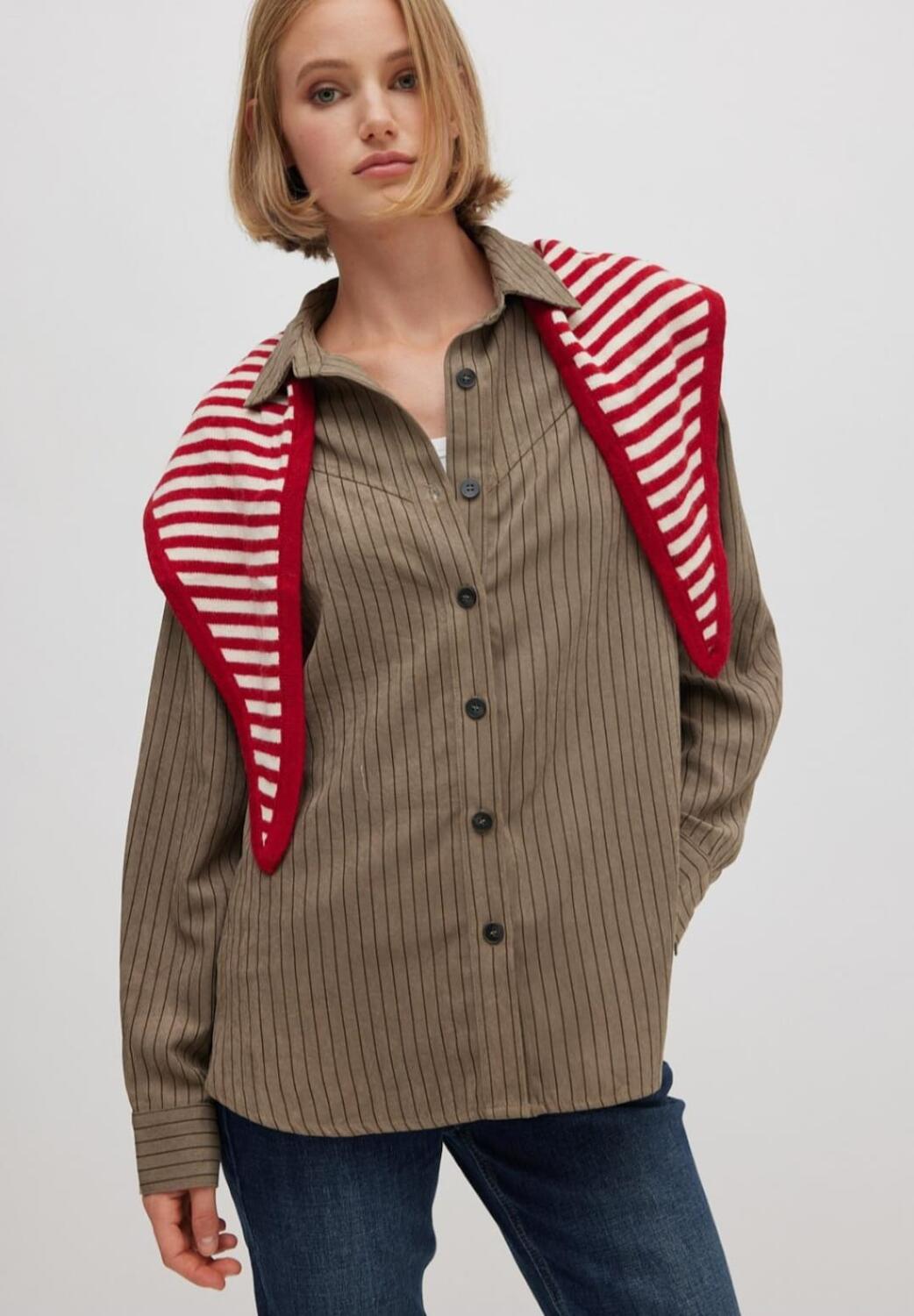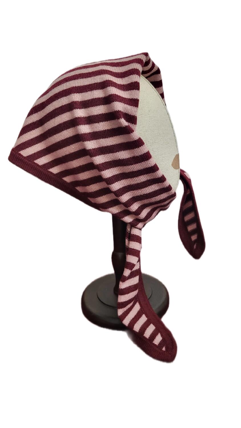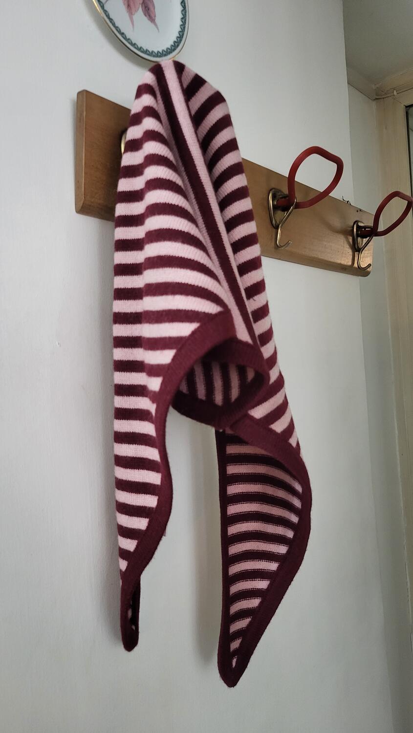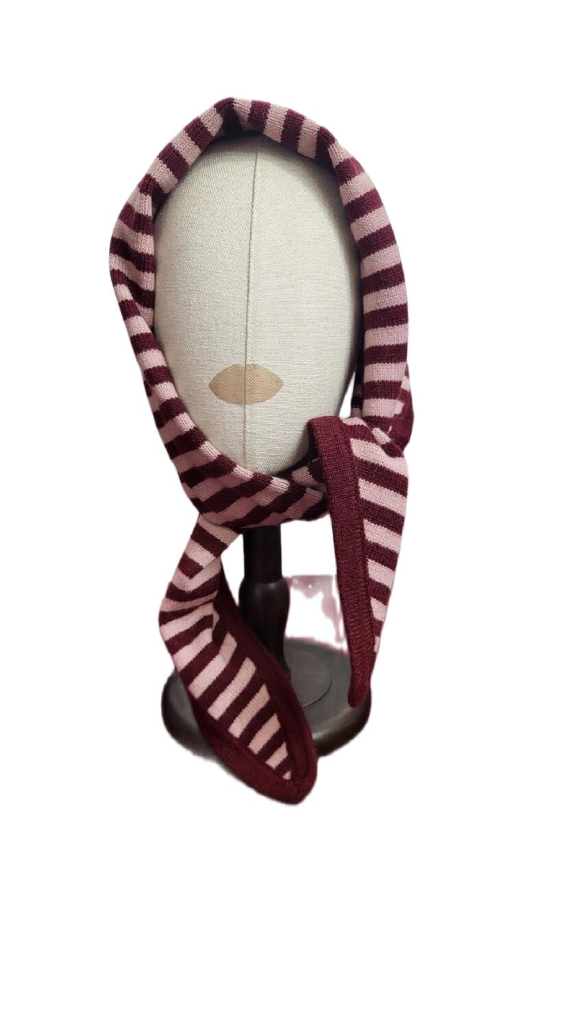 Sciarpa a forma di foulard in lana, nel mondo della moda questo stile è anche definito " Babushka Scarf", termine che viene ripreso dalla cultura dell'Europa dell' Est per definire il classico foulard della nonna legato sotto il mento, copricapo tipico di questi paesi. Il modello può essere indossato in diversi modi: come copricapo, come sciarpa e foulard al collo. Motivo in lana a righe colore bordeaux e rosa cipolla.