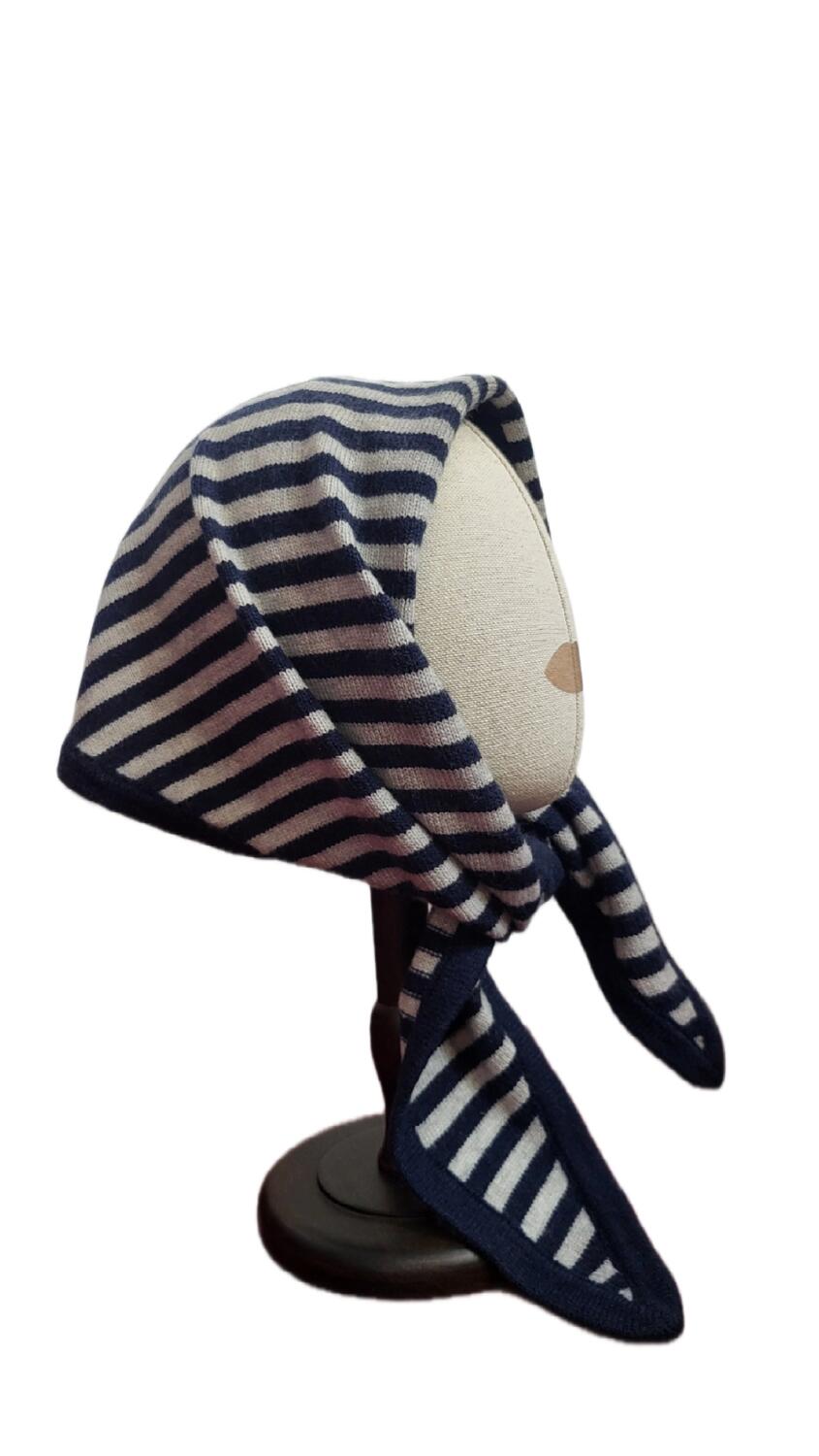 Sciarpa a forma di foulard in lana, nel mondo della moda questo stile è anche definito " Babushka Scarf", termine che viene ripreso dalla cultura dell'Europa dell' Est per definire il classico foulard della nonna legato sotto il mento, copricapo tipico di questi paesi. Il modello può essere indossato in diversi modi: come copricapo, come sciarpa e foulard al collo. Motivo in lana a righe colore blu e grigio.