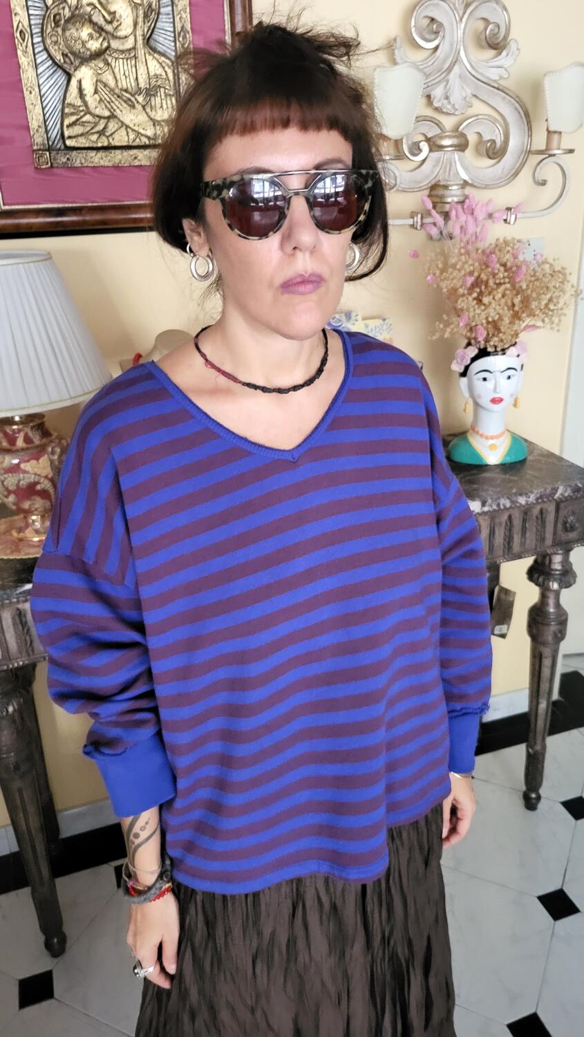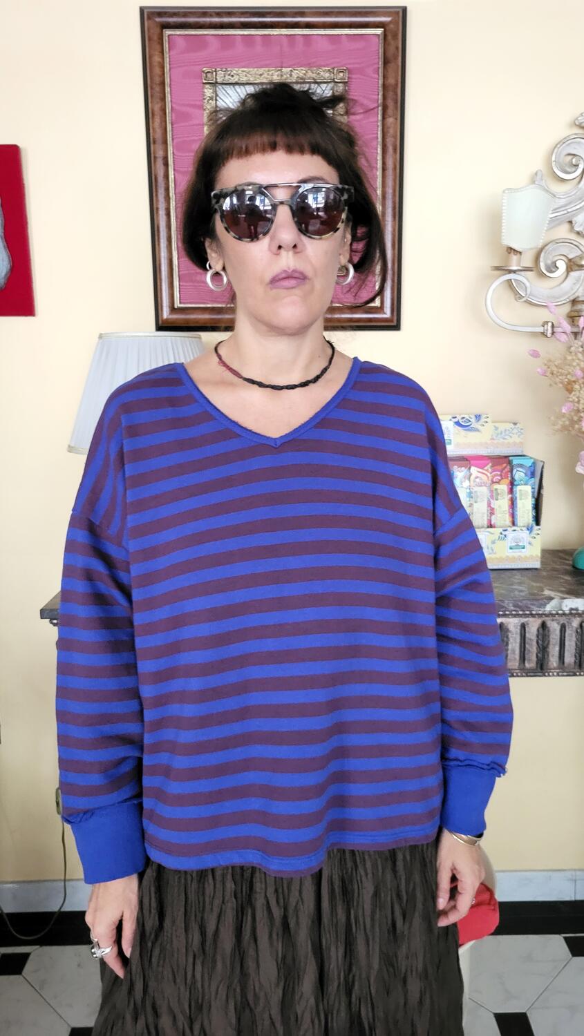 Felpa linea a righe, modello con scollo, bicolore blu cobalto e bordeaux