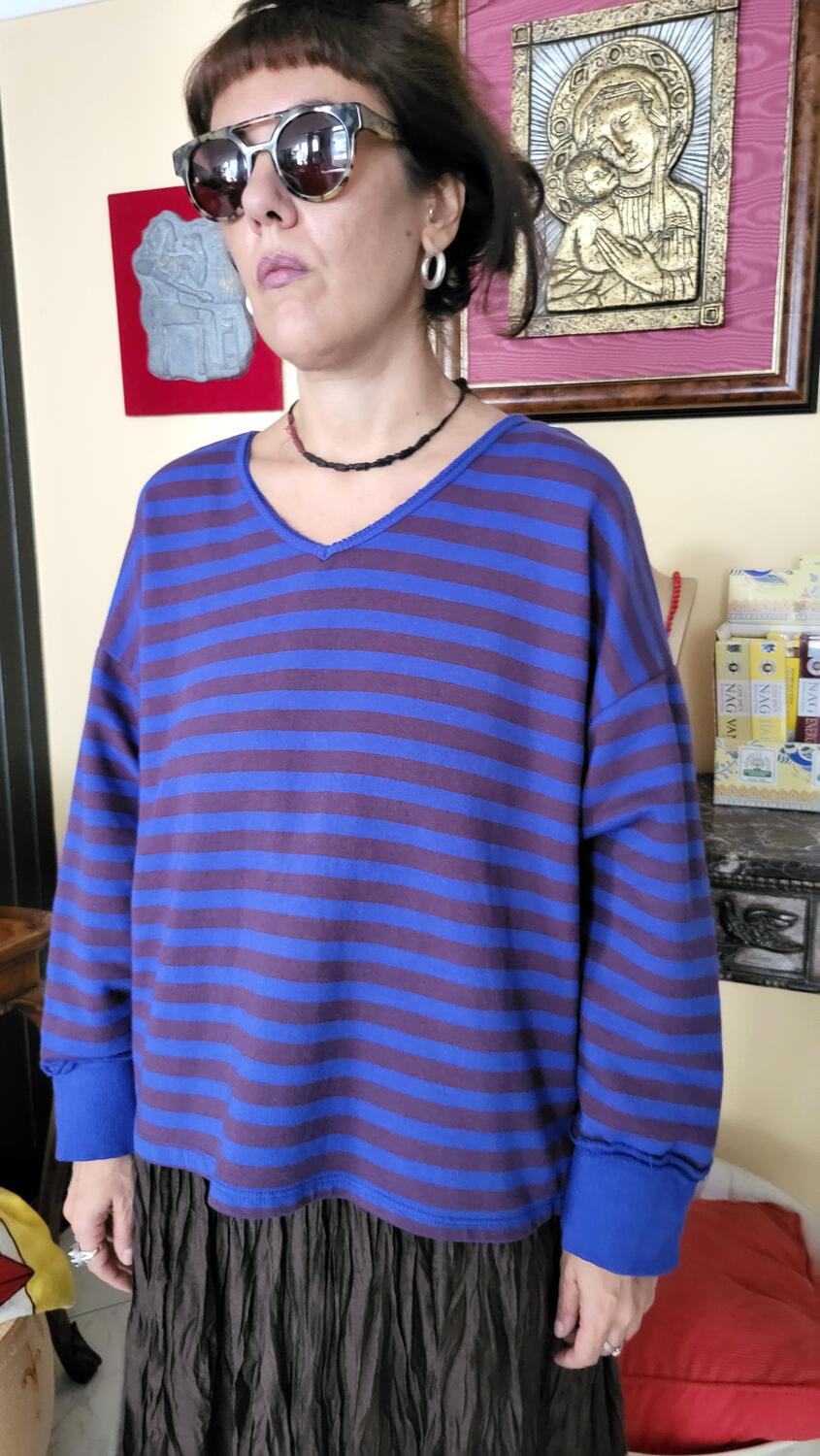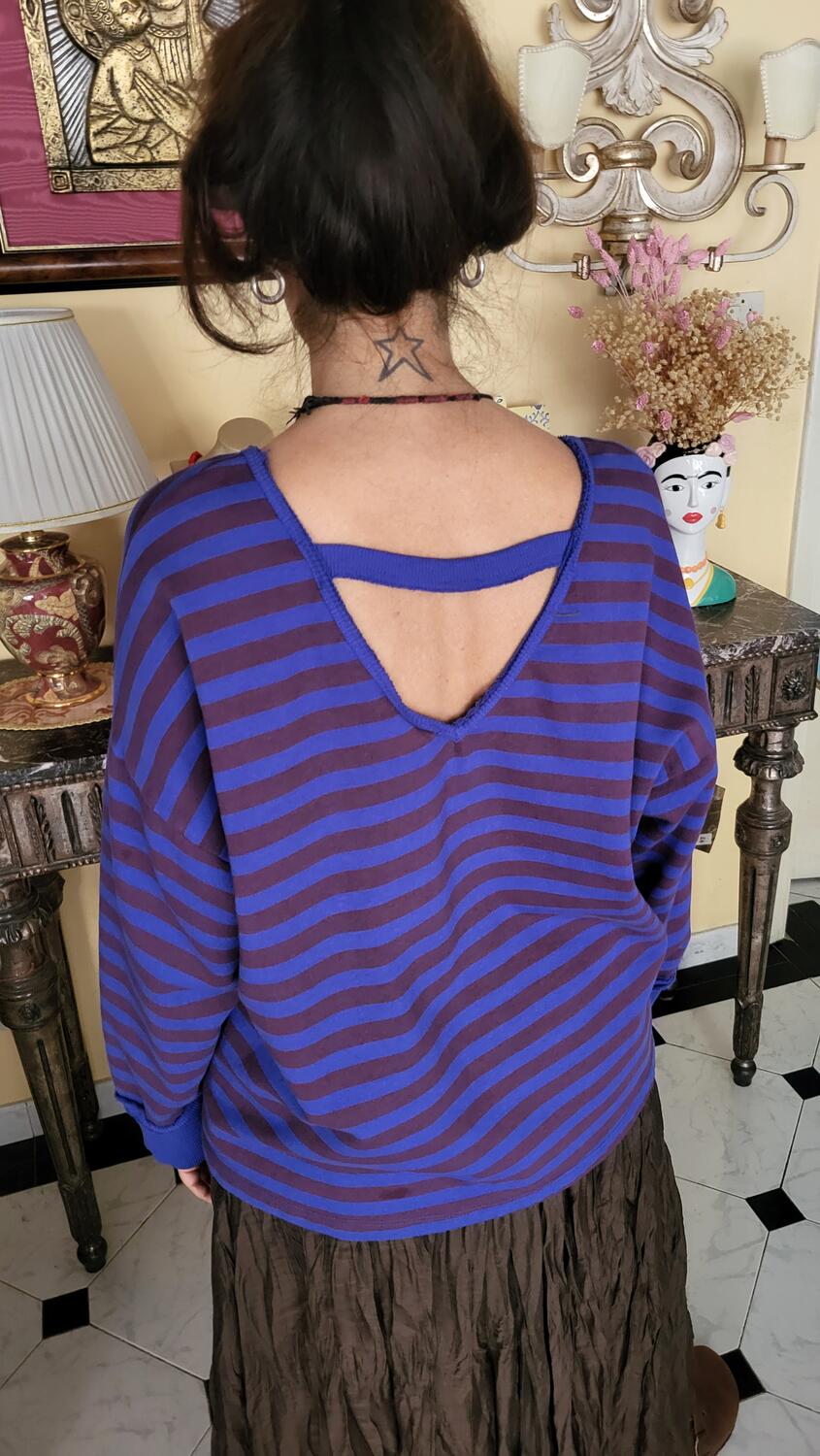 Felpa linea a righe, modello con scollo, in dettaglio lo scollo viene ripreso dietro la schiena. Linea bicolore in blu cobalto e bordeaux.
