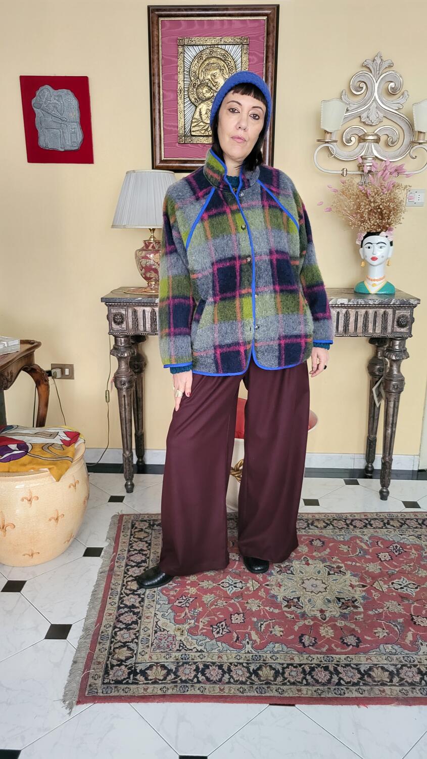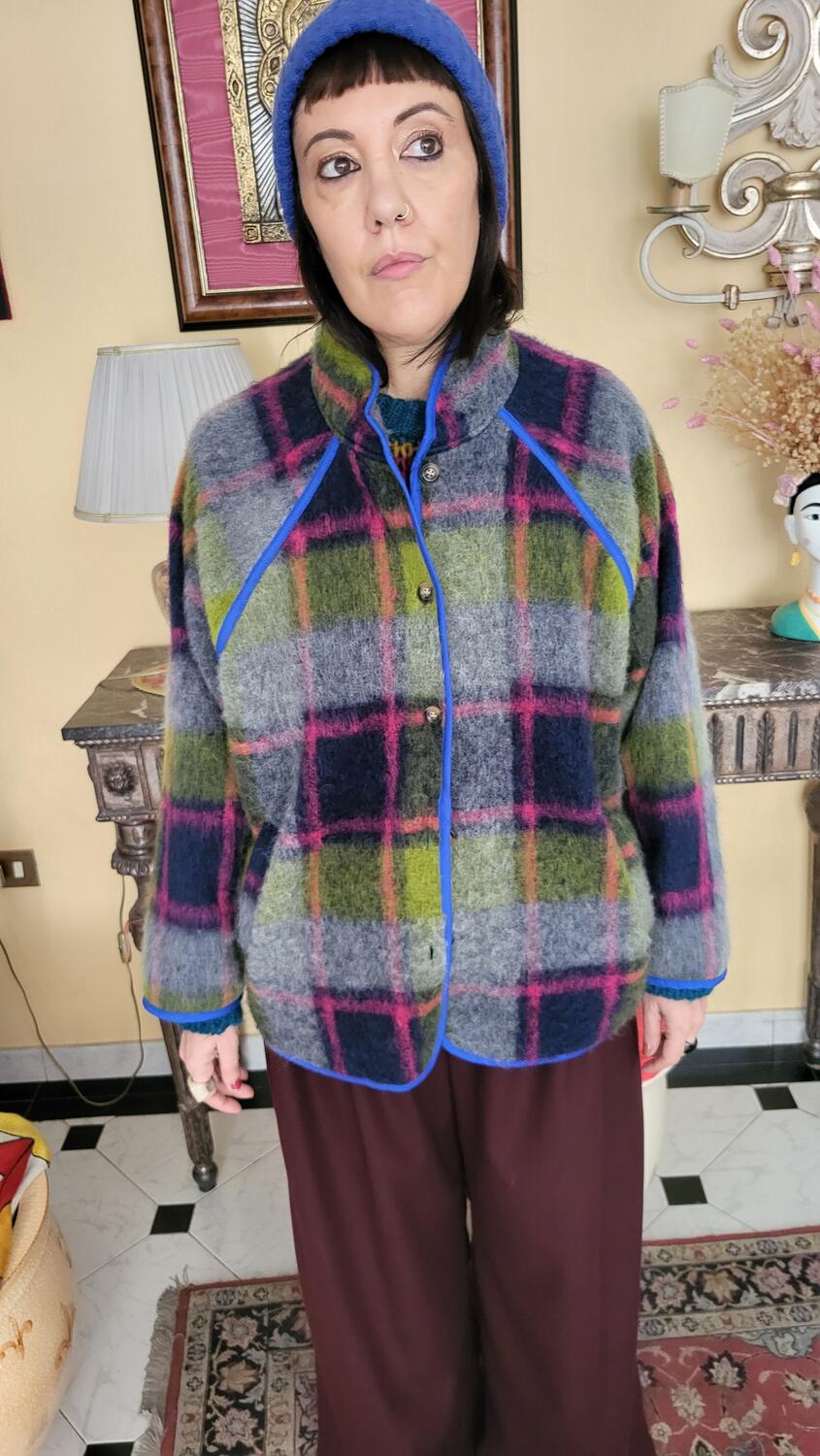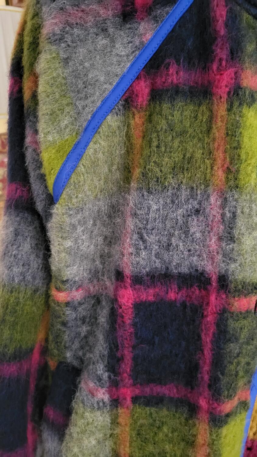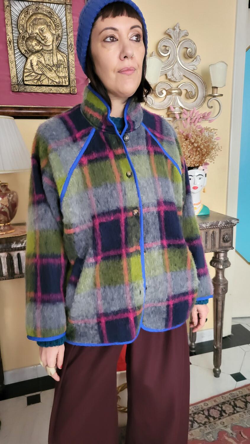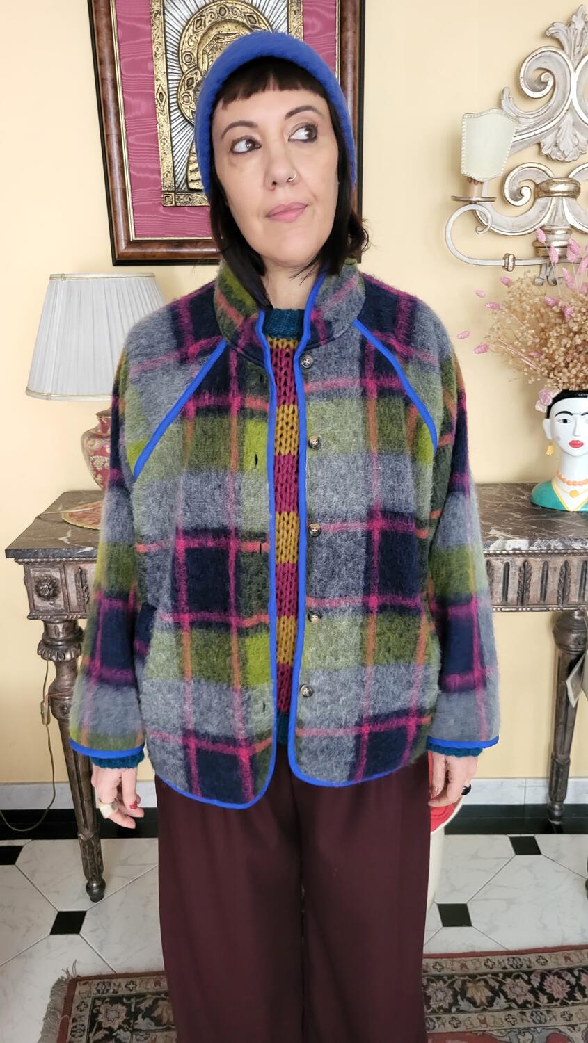 Cappottino stile giacca a quadri, linea classica con tasca in lana, in dettaglio reverse in blu elettrico. Tessuto in lana a quadri sulle tonalità del viola, verde, grigio.