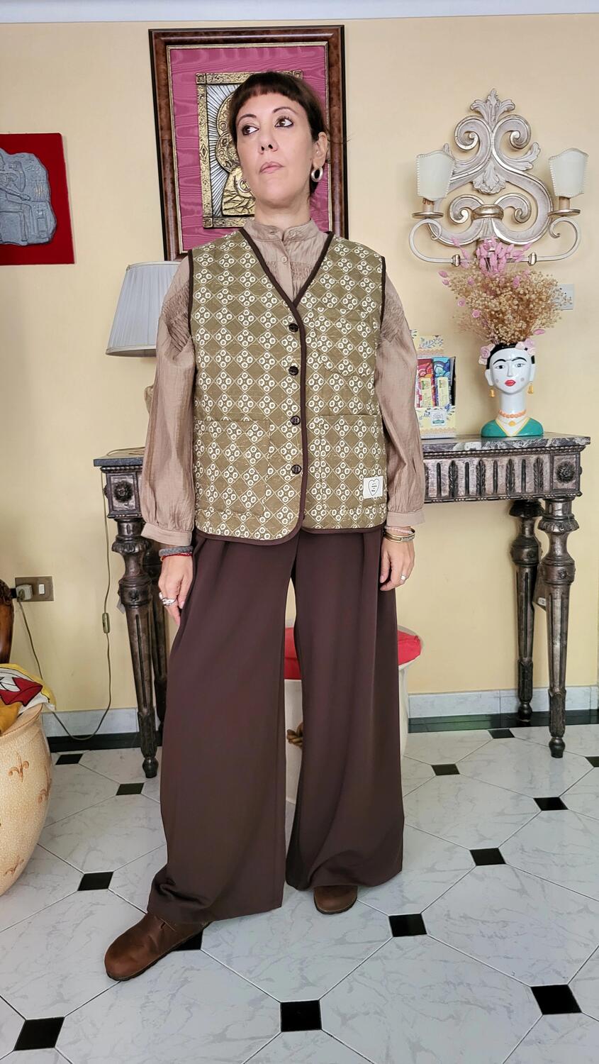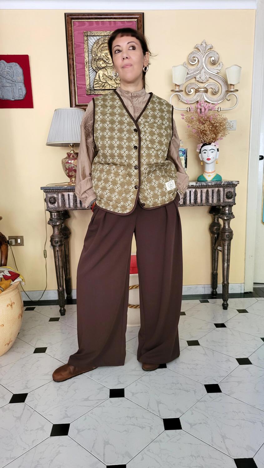 Gilet collezione matelassè, modello classico, tessuto con motivo floreale, verde e cacao