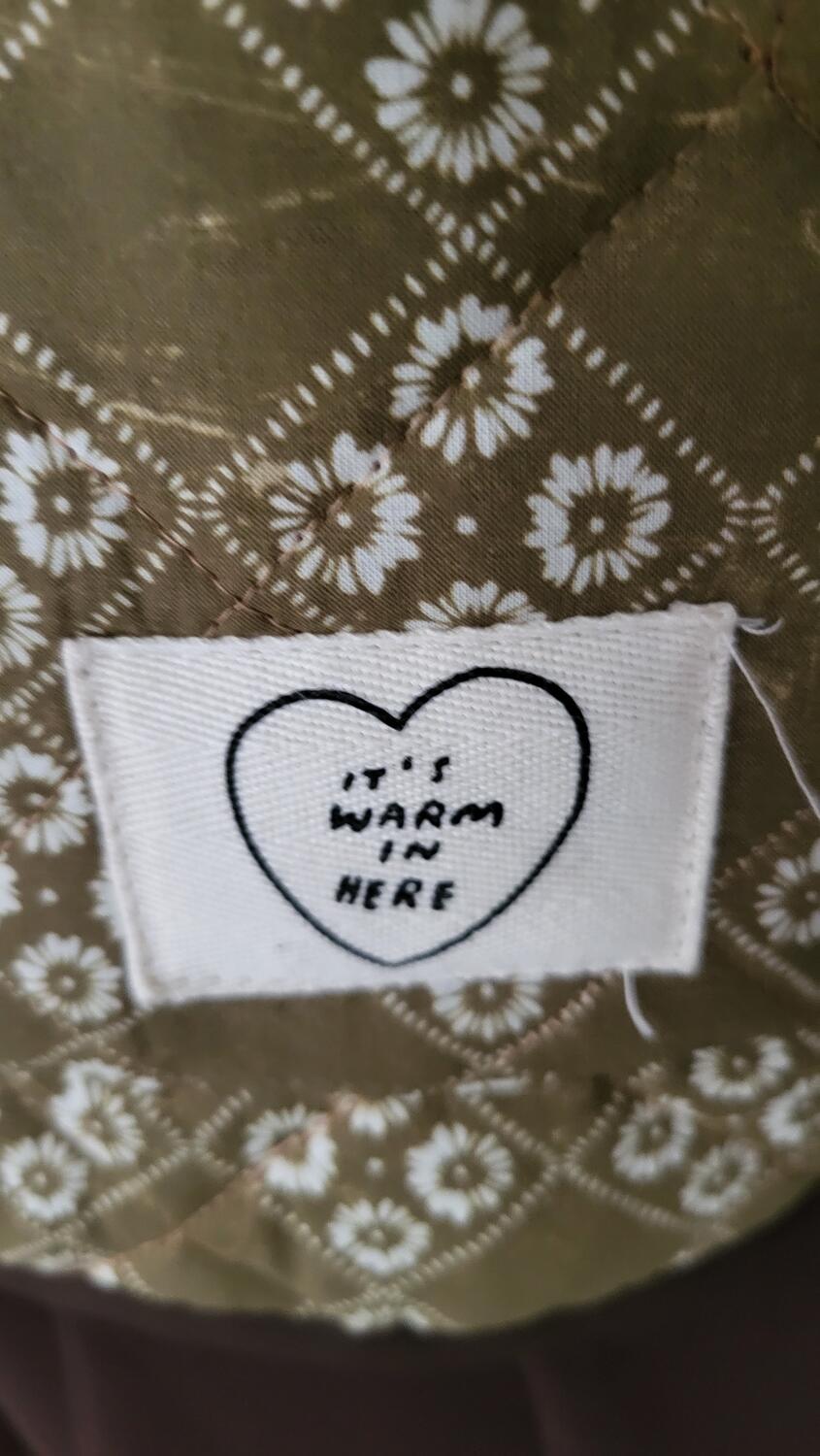 Gilet collezione matelassè, modello con taschine e bordi a contrasto cacao. Tessuto verde con motivo floreale delicato con fiorellini.