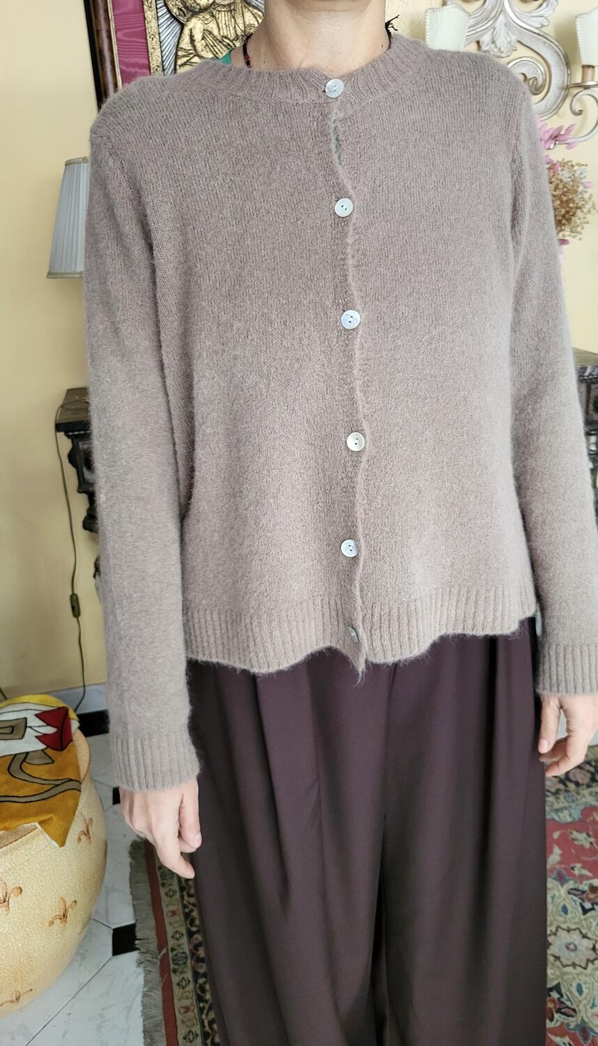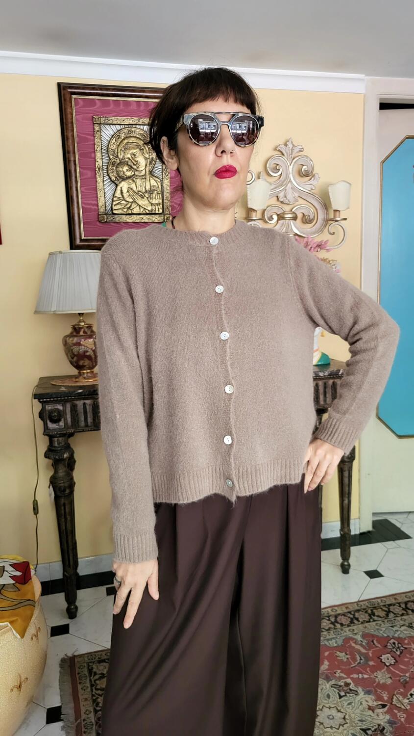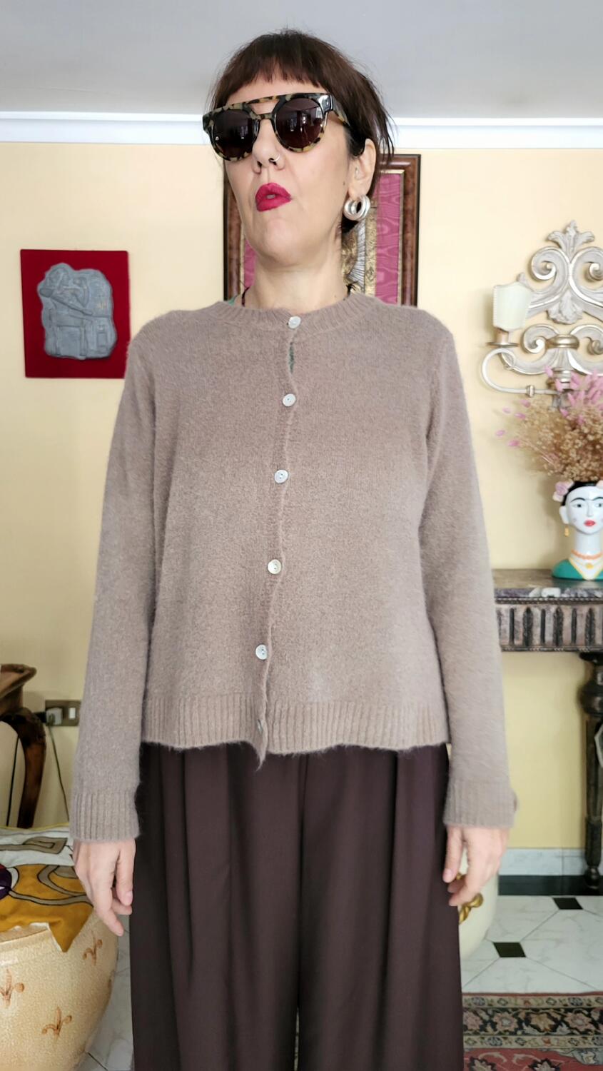 Golfino linea in baby alpaca, modello classico, in dettaglio bottoni madreperla, colore camel