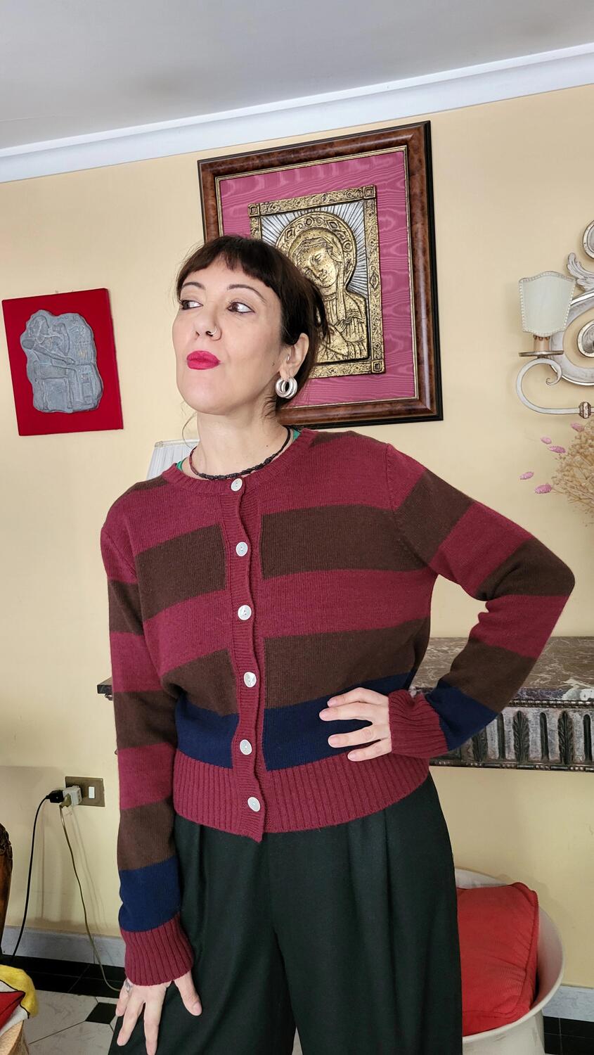 Golfino collezione lana e cashmere, modello classico, in dettaglio bottone madreperla, motivo a righe bordeaux/cacao/blu