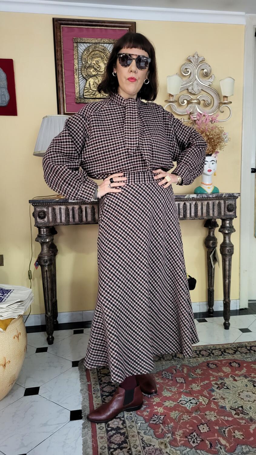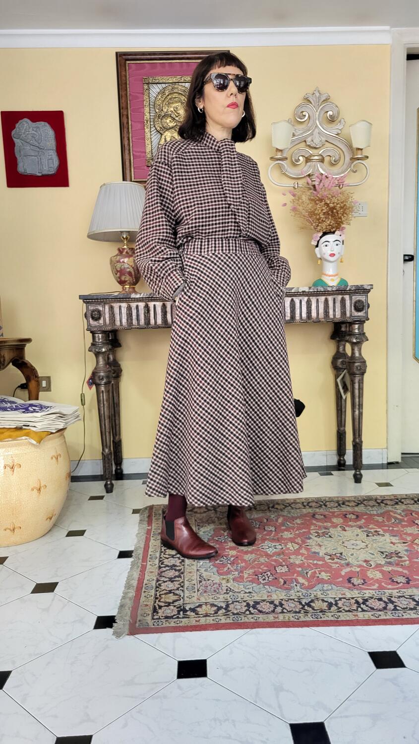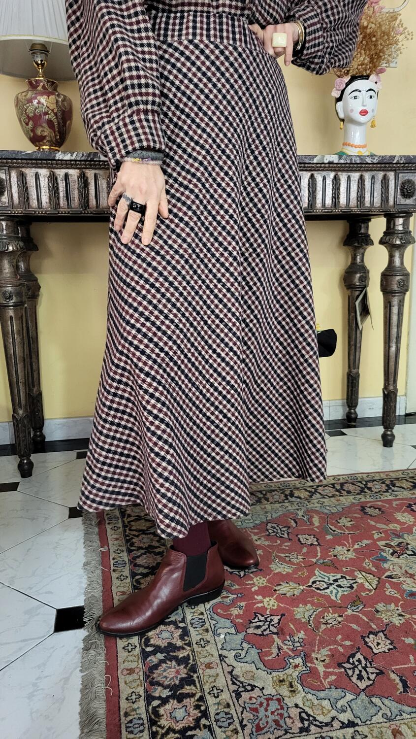 Gonna linea classica, modello midi con tasche, vita elastica, tessuto in check tonalità bordeaux. Suggerimento di stile se abbinata alla camicia in coordinato l'effetto è quello di un abitino.