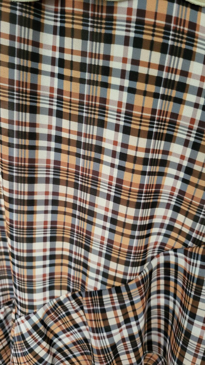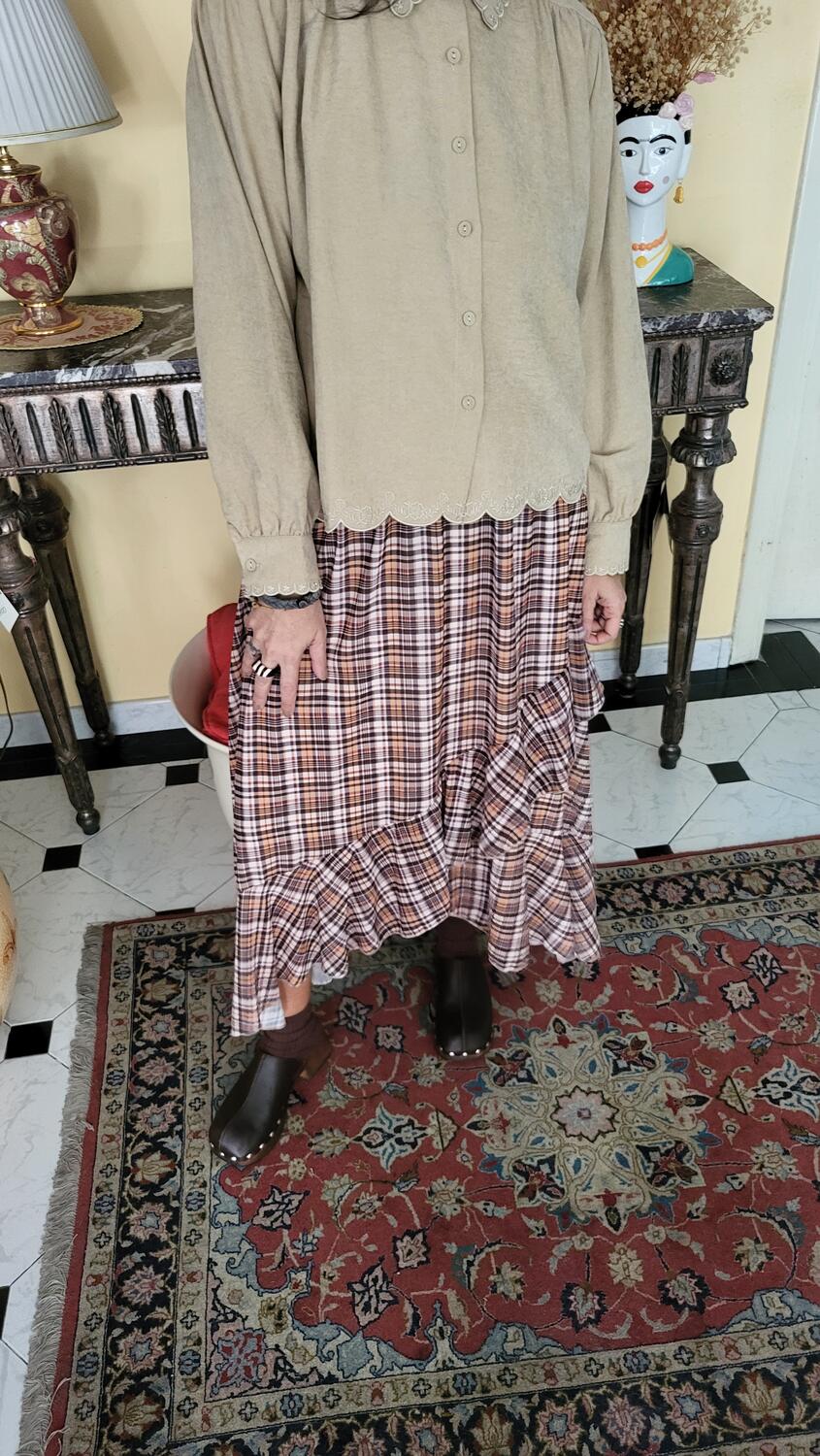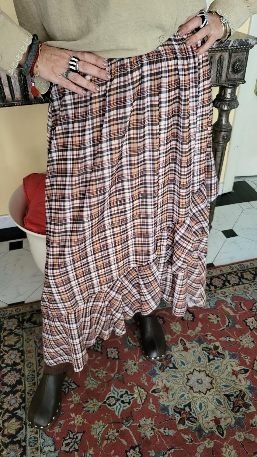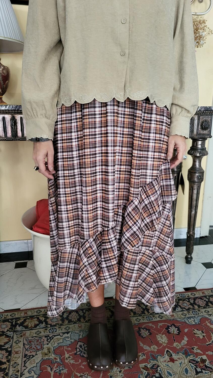 Gonna linea midi, modello elastico in vita, in dettaglio balza asimmetrica, tessuto grafico tartan mix di tonalità cacao, senape con fodera in beige.
