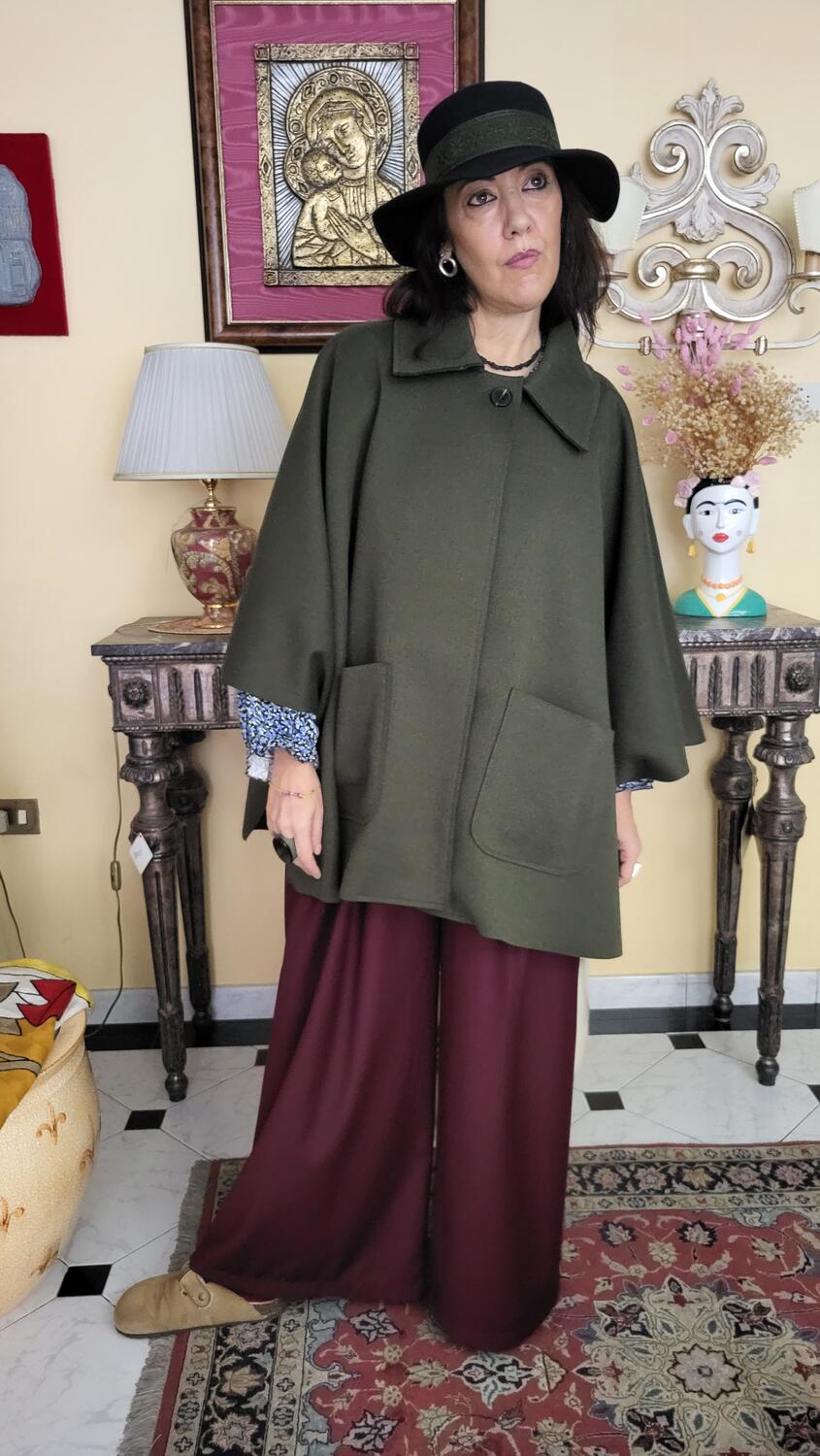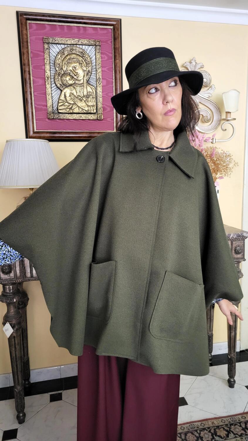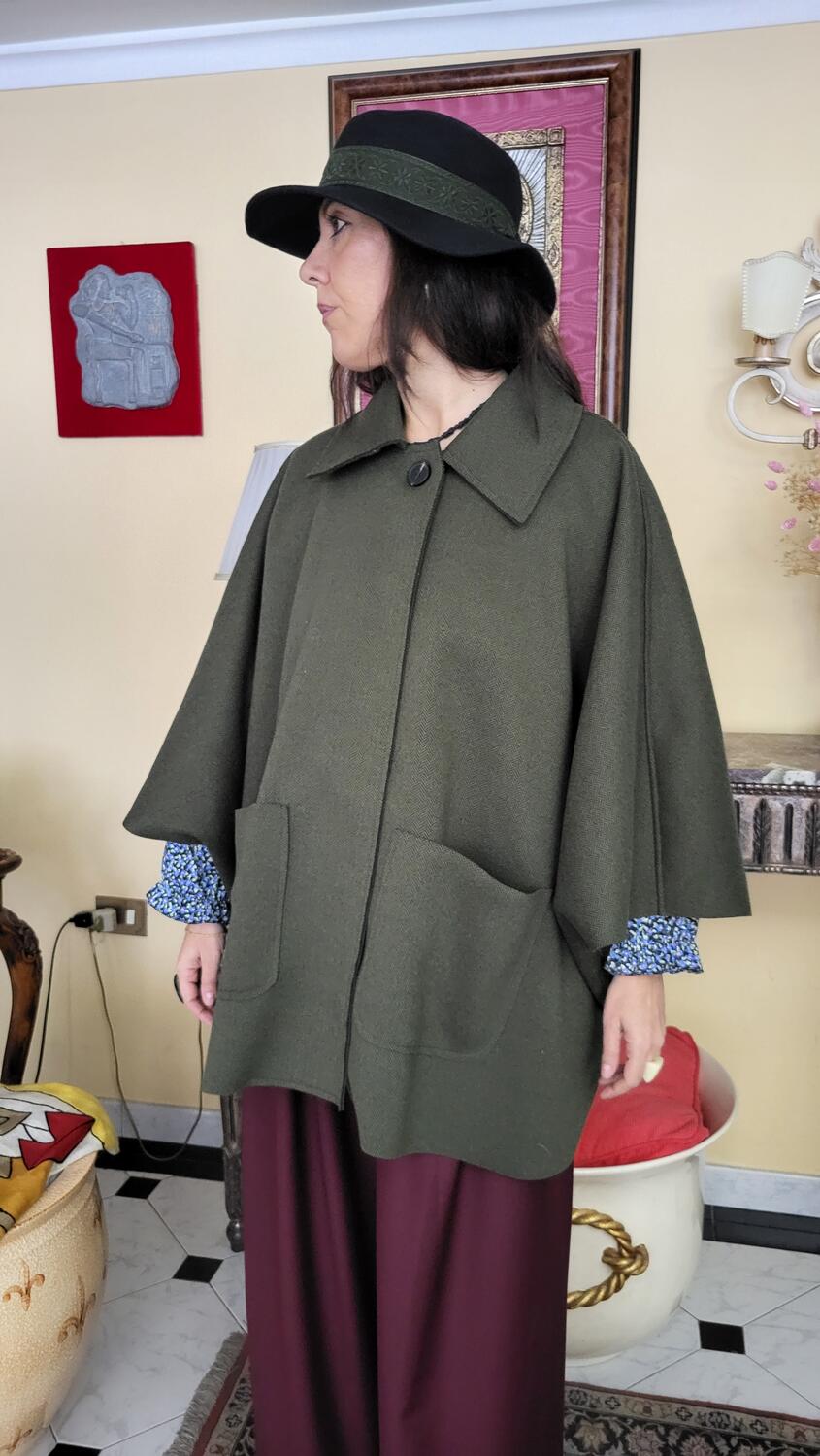 Cappottino modello mantella, stile classico, modello con maxi tasca e bottone centrale, colore verde