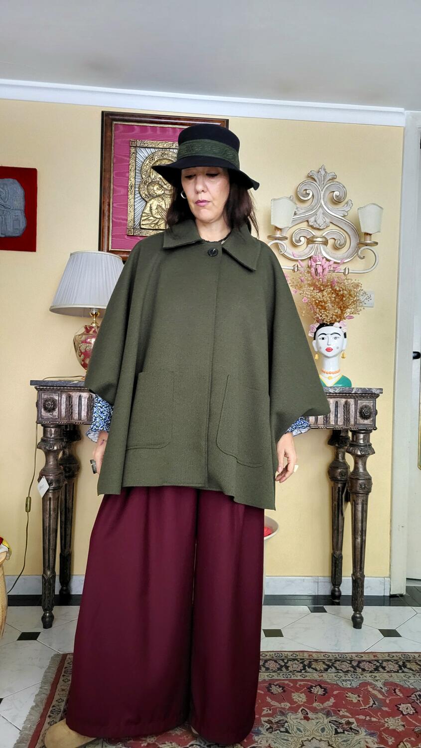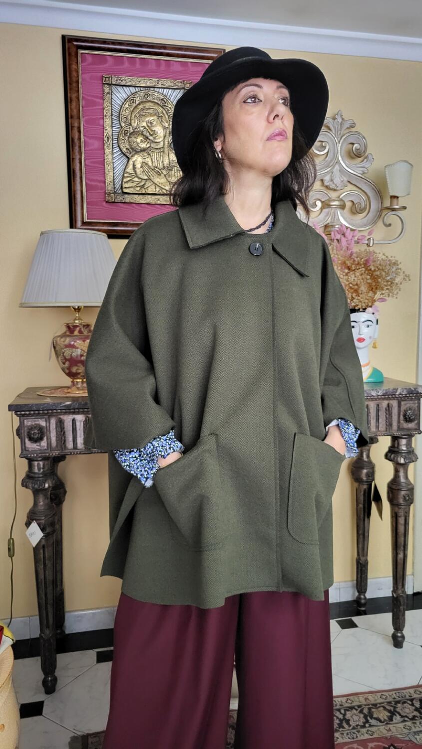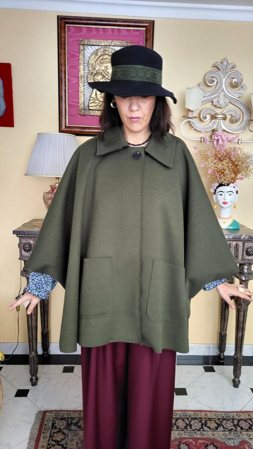 Cappottino modello mantella, stile classico, modello con maxi tasca e bottone centrale, colore verde