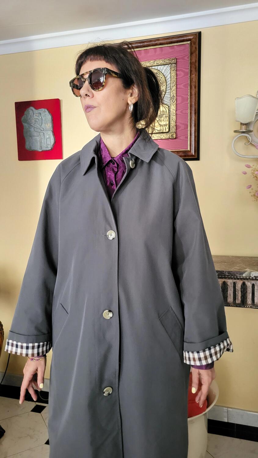 Trench collezione classica, modello lungo con tasche, in dettaglio bellissima fodera a quadretti colore cacao, blu, panna che può essere messa in risalto dando carattere al capo con il risvolto delle maniche. Colore grigio