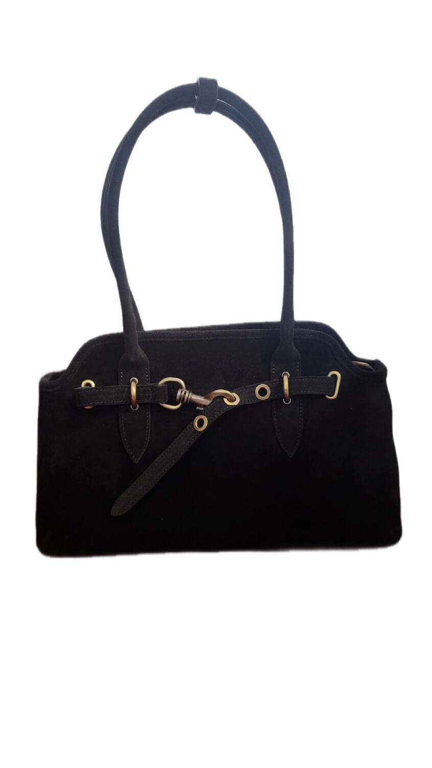 Borsa linea in suede, manici lunghi, elementi in bronzo, colore nero