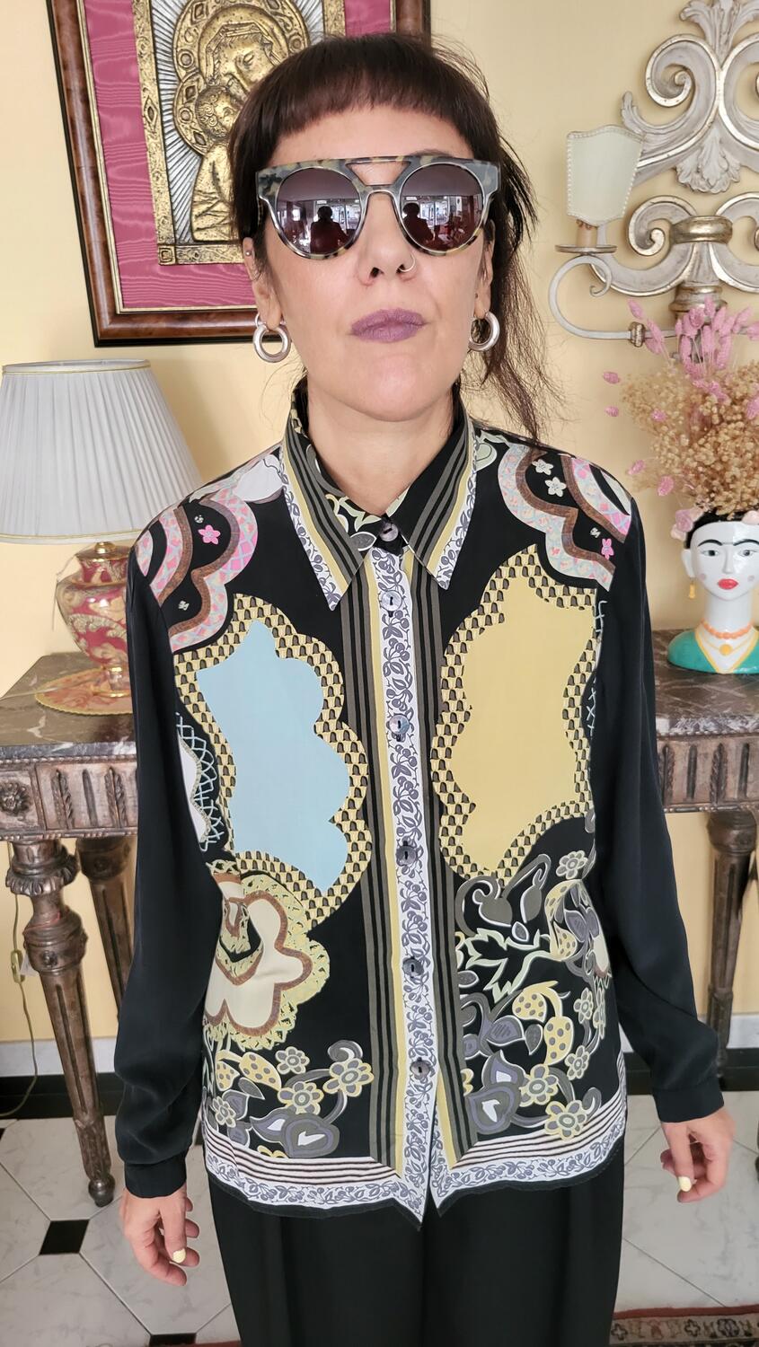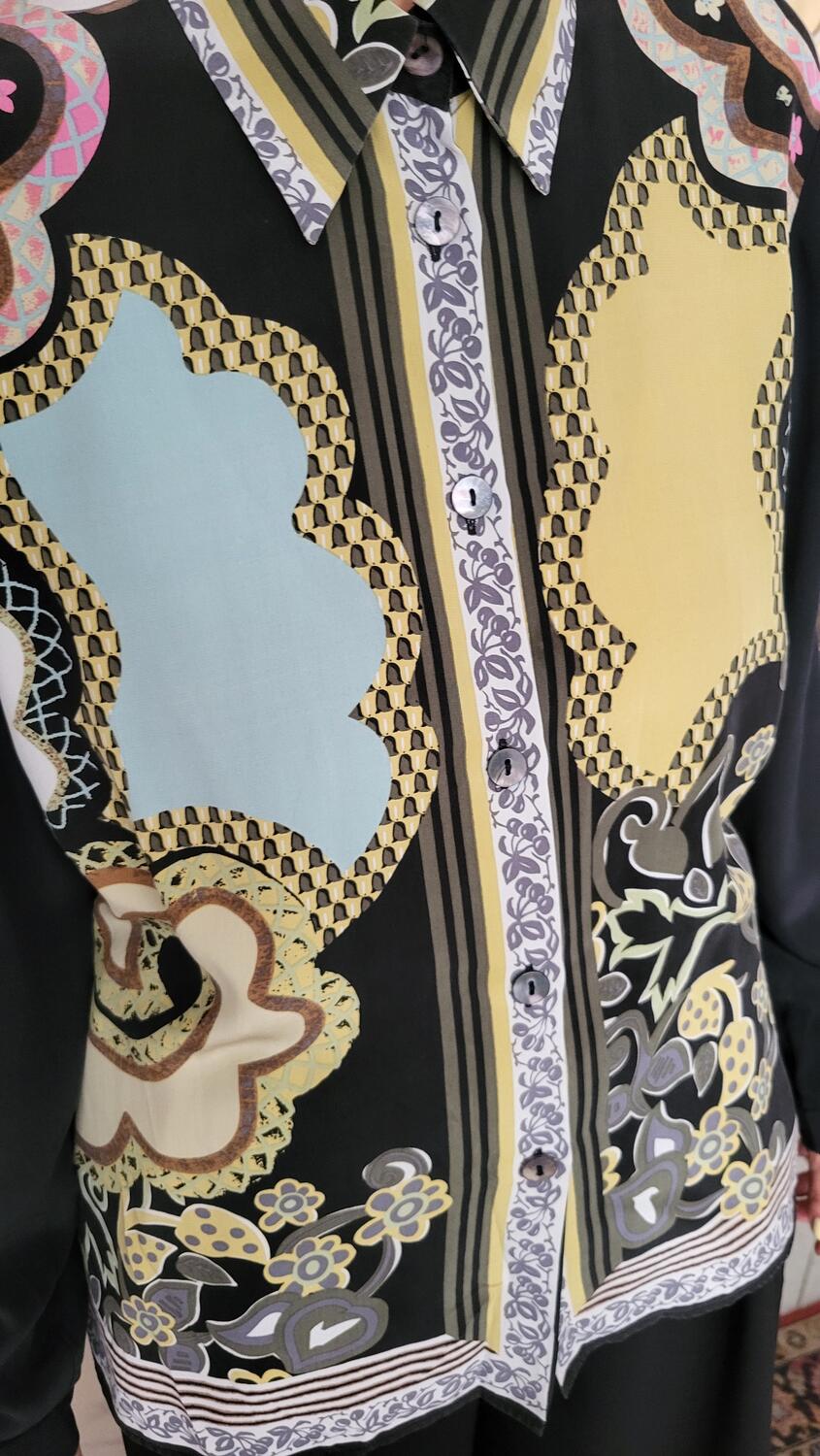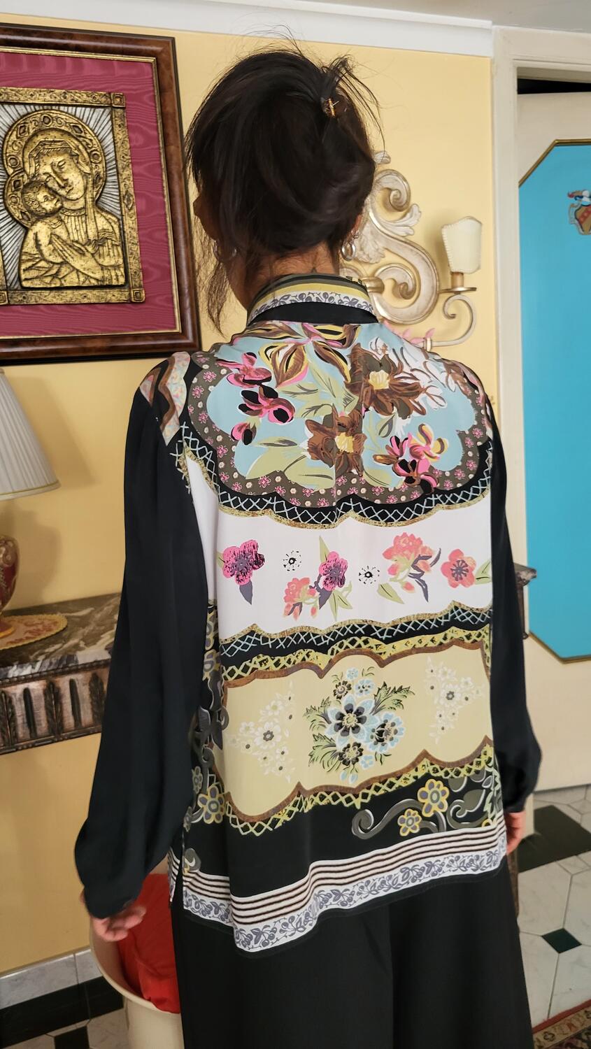 Camicia linea in pura seta, modello classico, il tessuto è caratterizzato da un bellissimo motivo grafico florale in chiave orientale (ricorda molto i fiori giapponesi), sia davanti che dietro la schiena. Colore nero