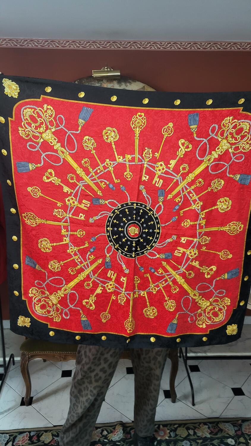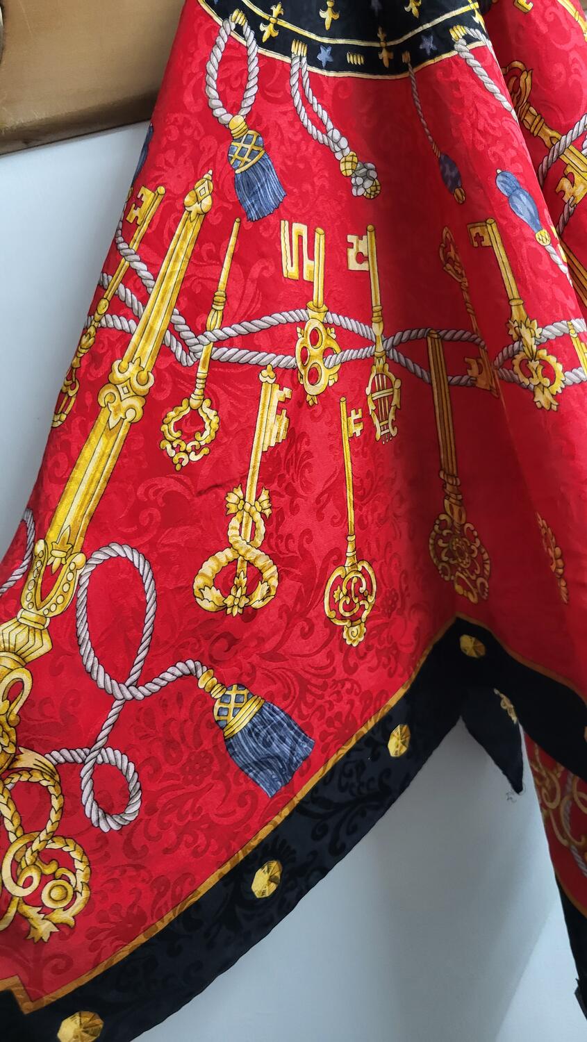 Foulard collezione in pura seta, modello medio grande, particolare stampa grafica nella tonalità rosso e nero