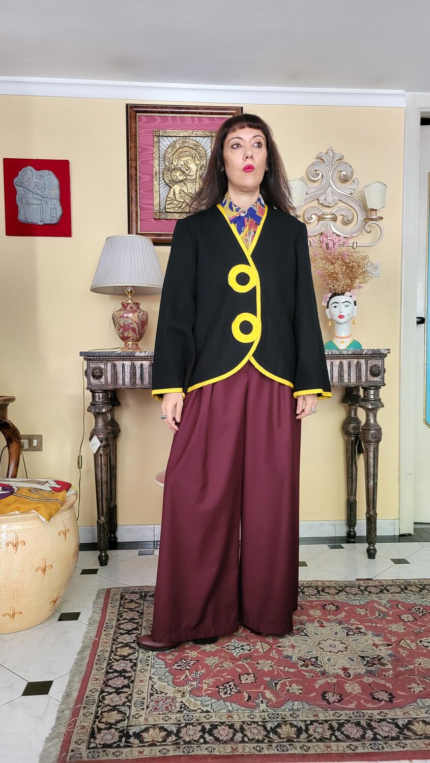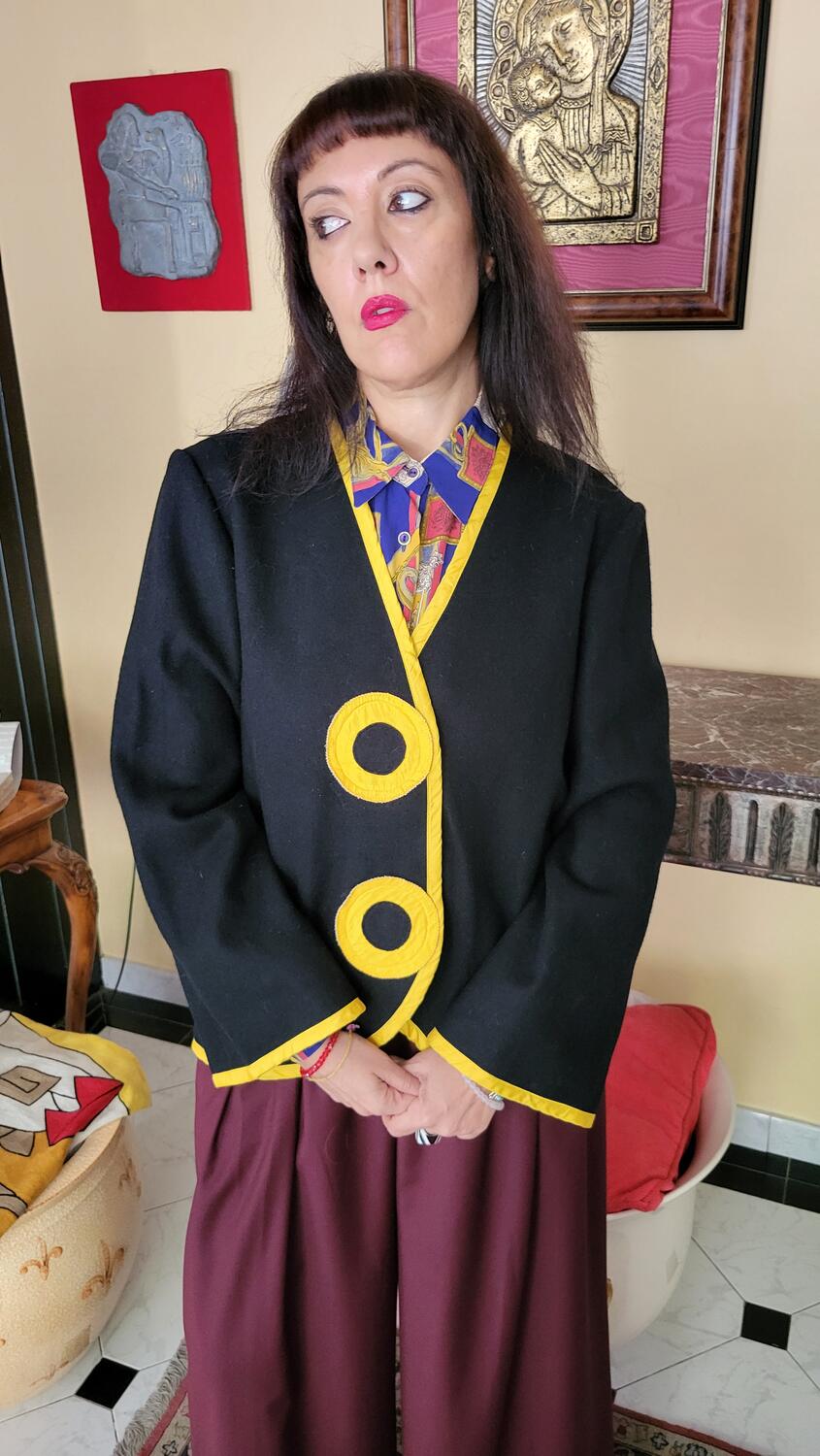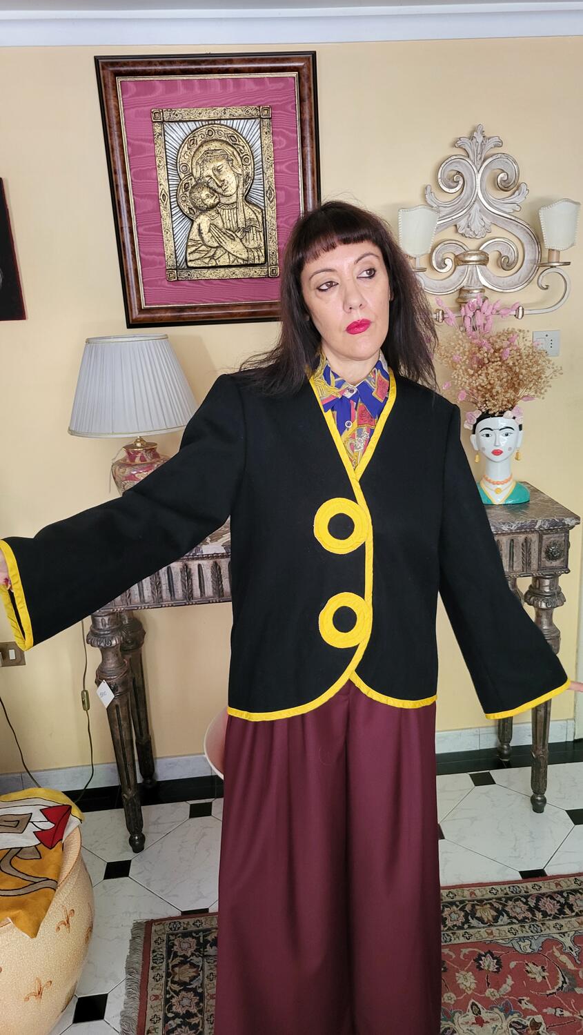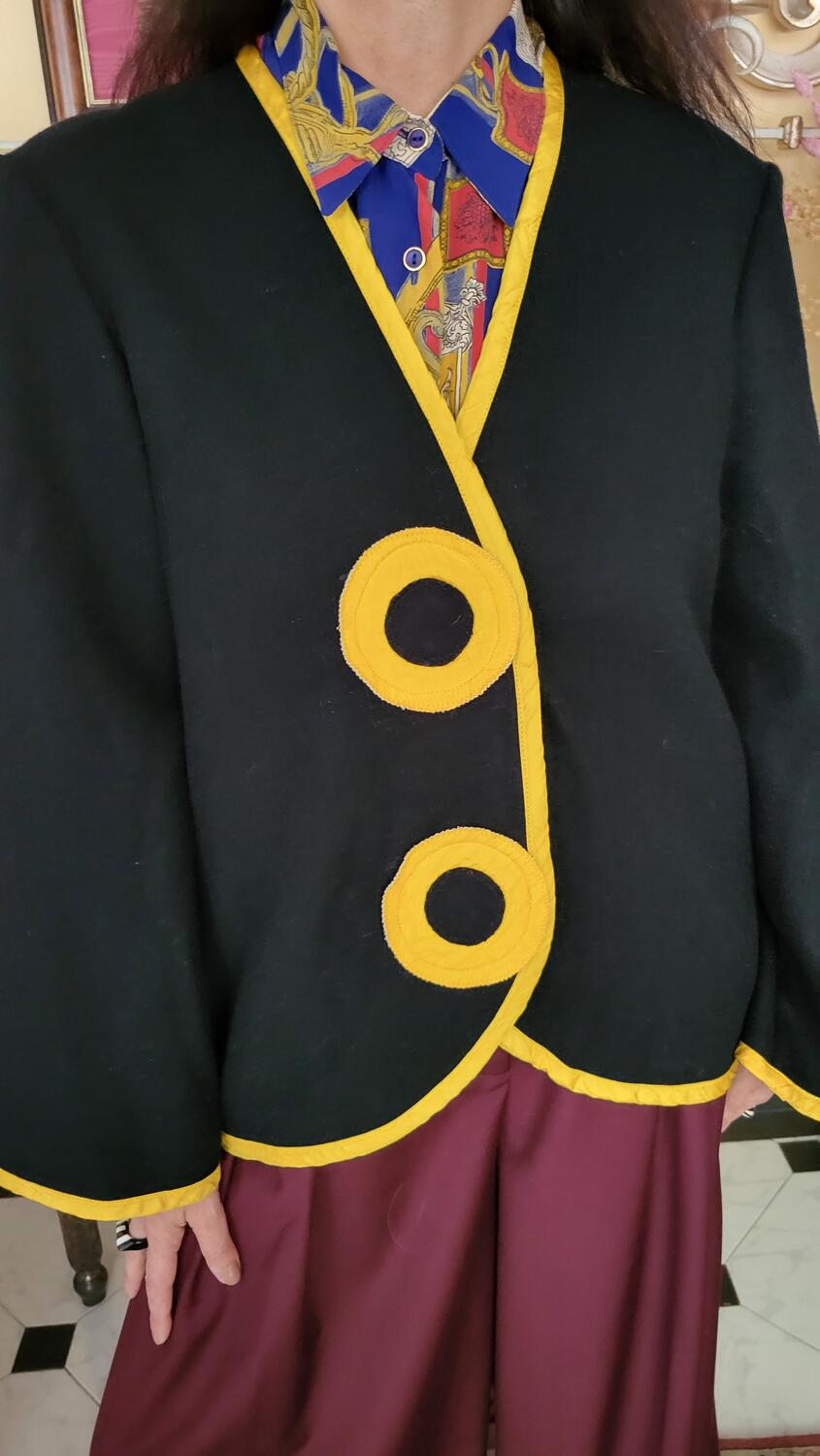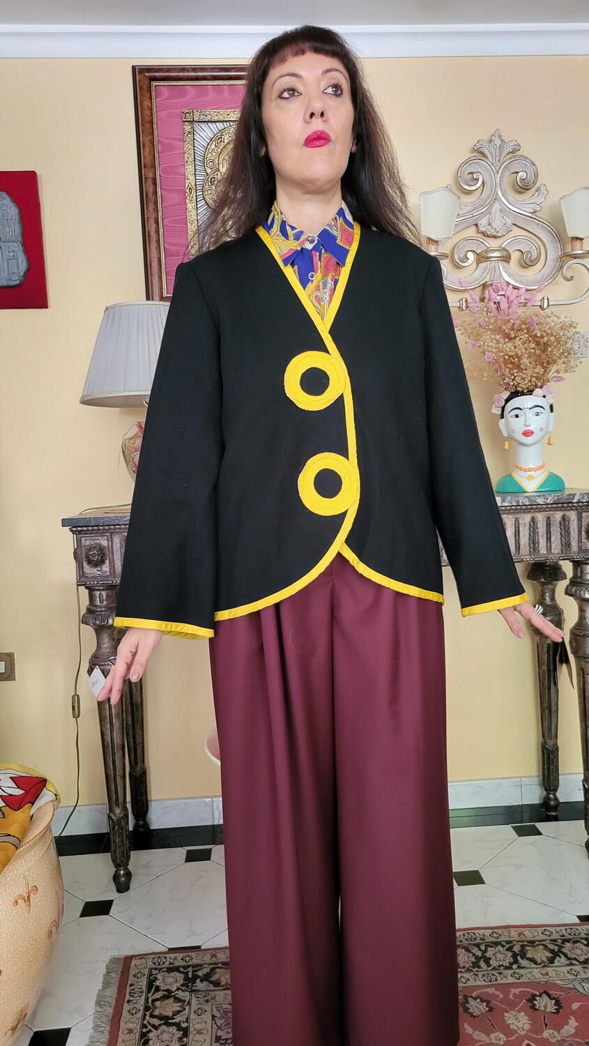 Giacca collezione in lana di una boutique di Valenza, lo stile si ispira alla collezioni orientali. Taglio classico con manica leggermente a campana, in dettaglio bordatura in raso giallo, il colore in raso caratterizza anche gli elementi geometrici davanti. Tessuto in panno lana nero.