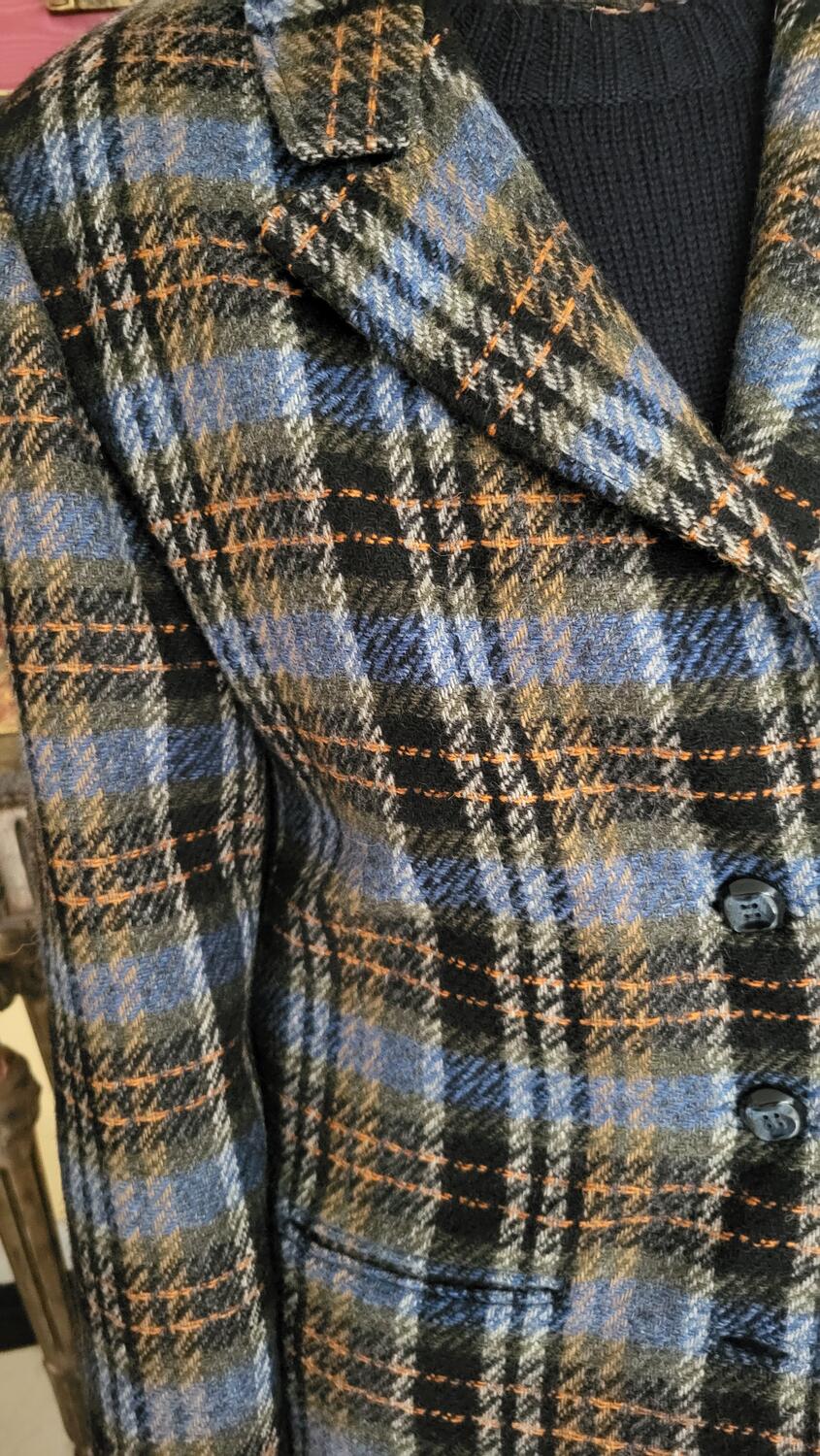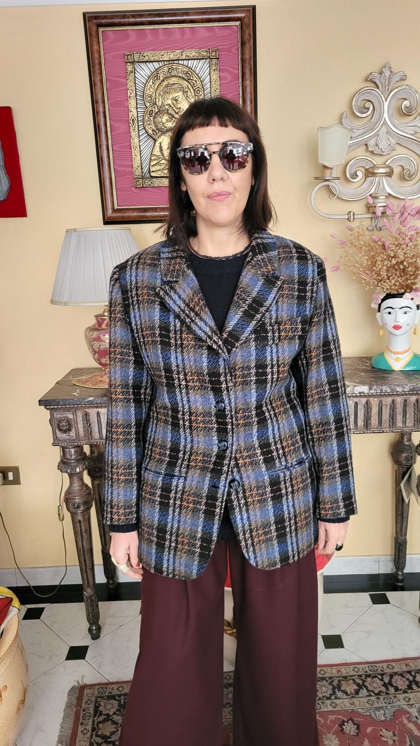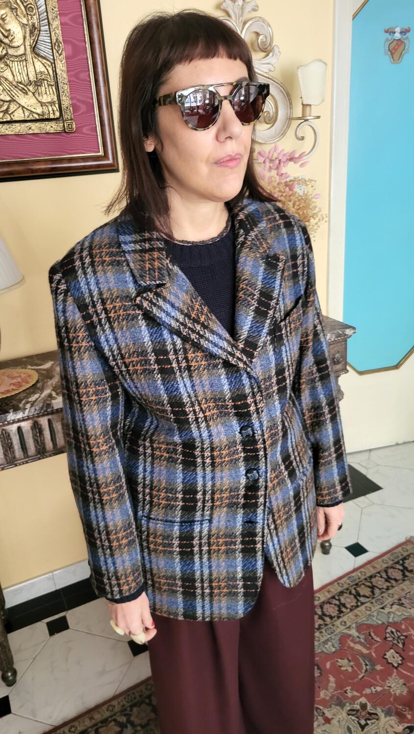 Giacca collezione sartoriale, linea classica con tasche, in dettaglio bellissimo bottone in blu cangiante. Tessuto in pura lana motivo stile inglese, tonalità avion, nero, verde kaki, fodera in bluette.