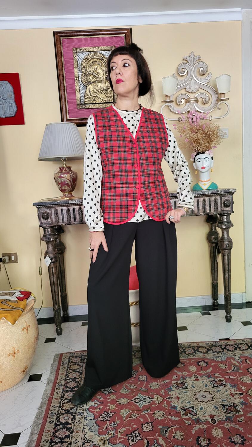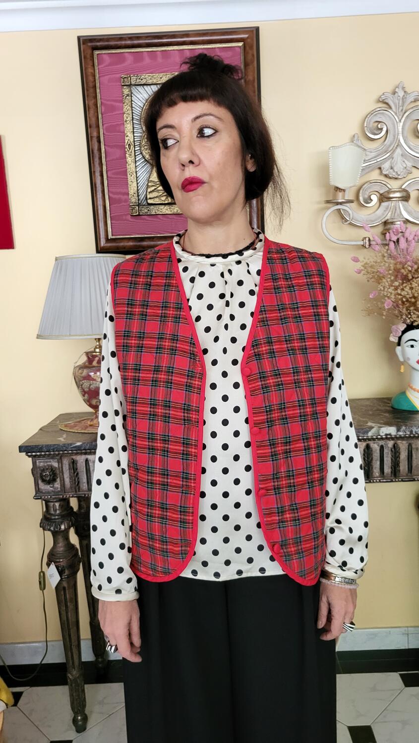 Gilet linea classica, modello matelassè, in dettaglio bottoncini tondi in tessuto rosso, stampa grafica tartan in rosso. Sull'etichetta interna è presente un bottone di ricambio.