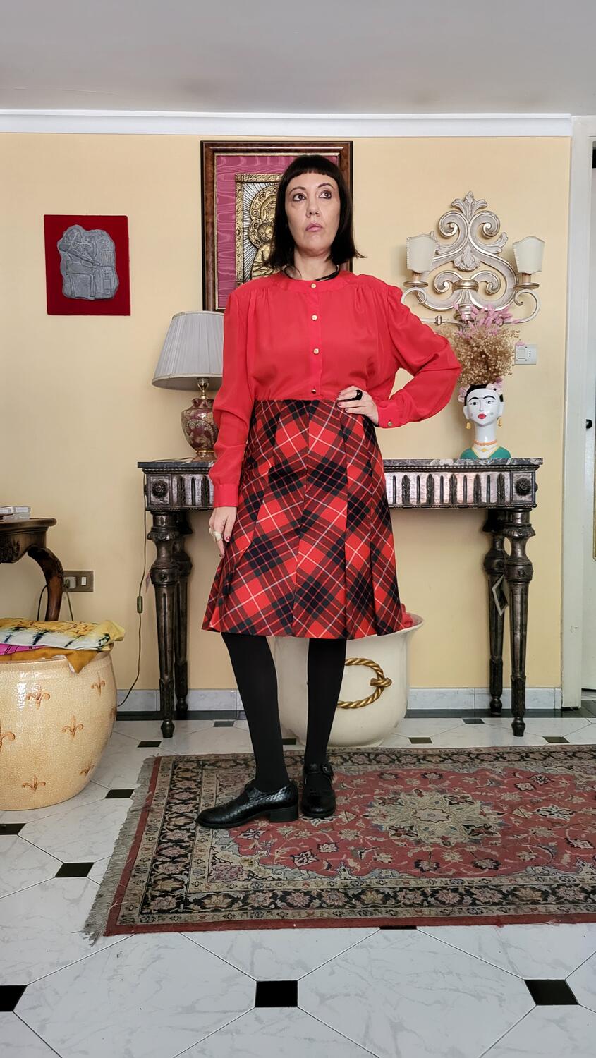 Gonna linea classica scozzese, modello midi vita alta svasato, tessuto in lana vergine tartan rosso