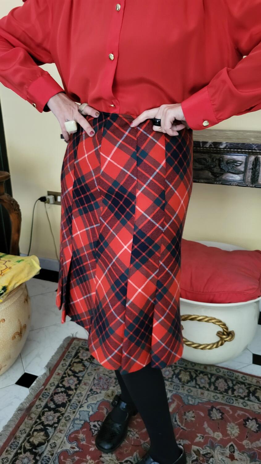 Gonna linea classica scozzese, modello vita alta svasata a pieghe, lunghezza midi, tessuto classico in lana vergine, motivo tartan in rosso, verde, blu, fodera rossa.