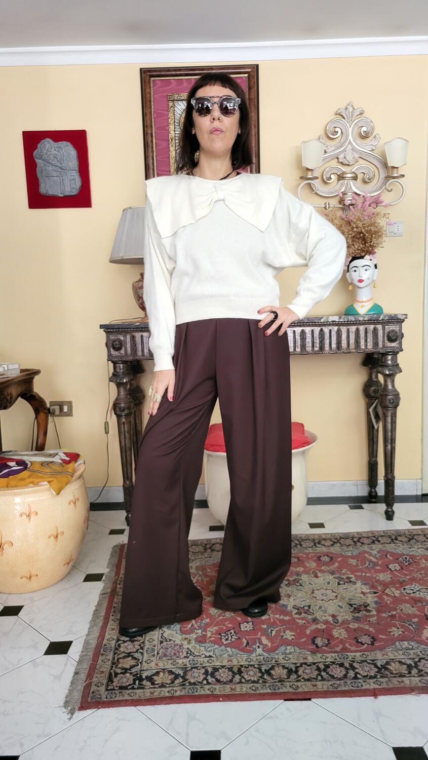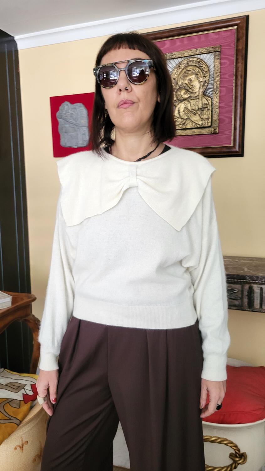 Pullover collezione Benetton, da etichetta linea storica, in dettaglio maxi fiocco centrale in lana , colore panna