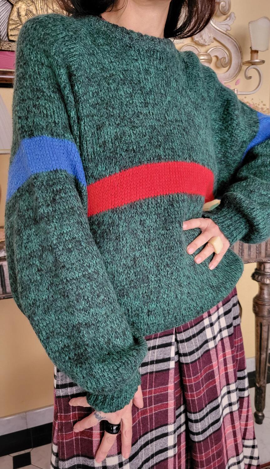 Pullover modello classico americano, probabile linea maschile, trama lana verde melangiato con banda grafica in rosso e azzurro avion.